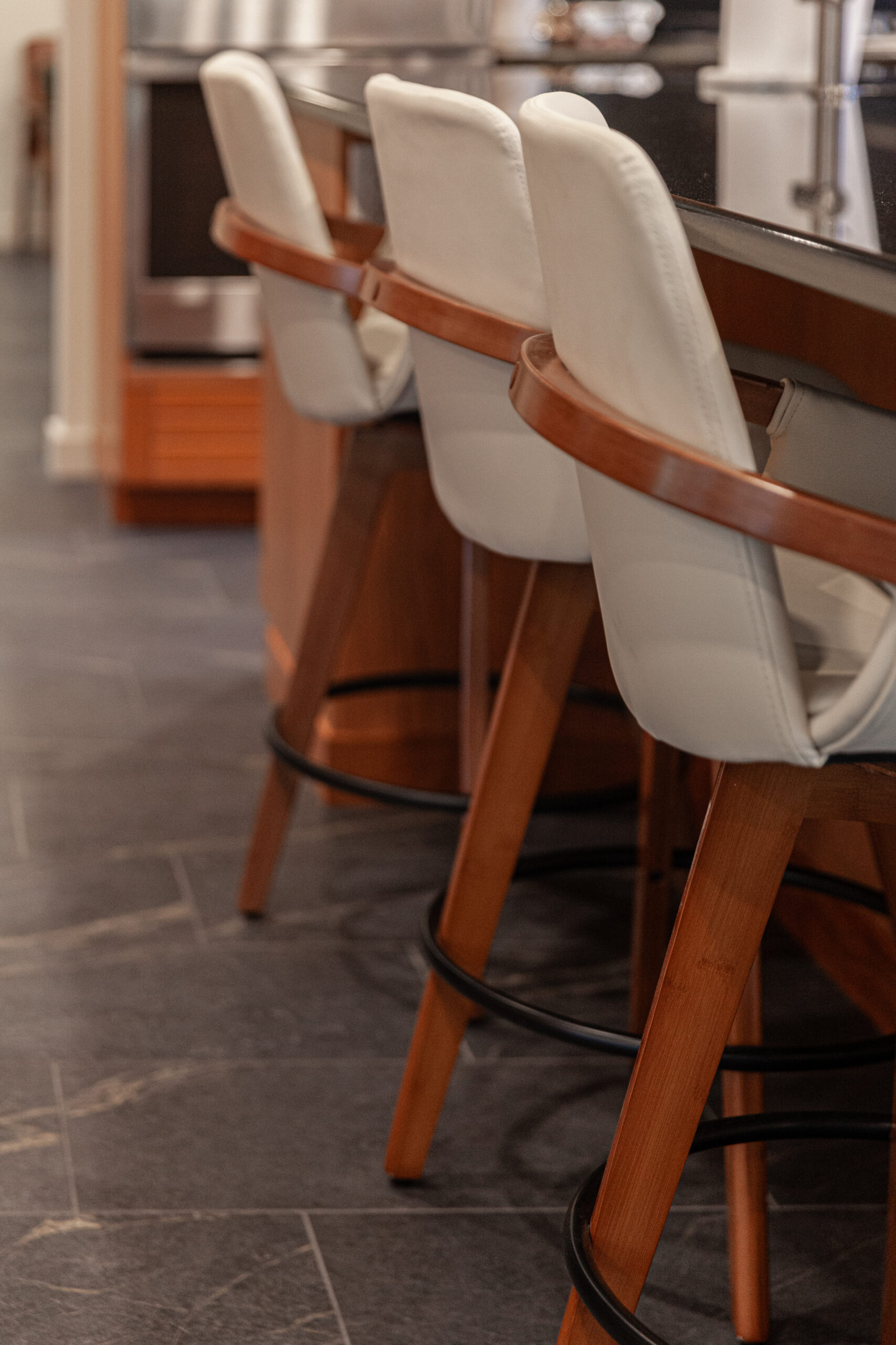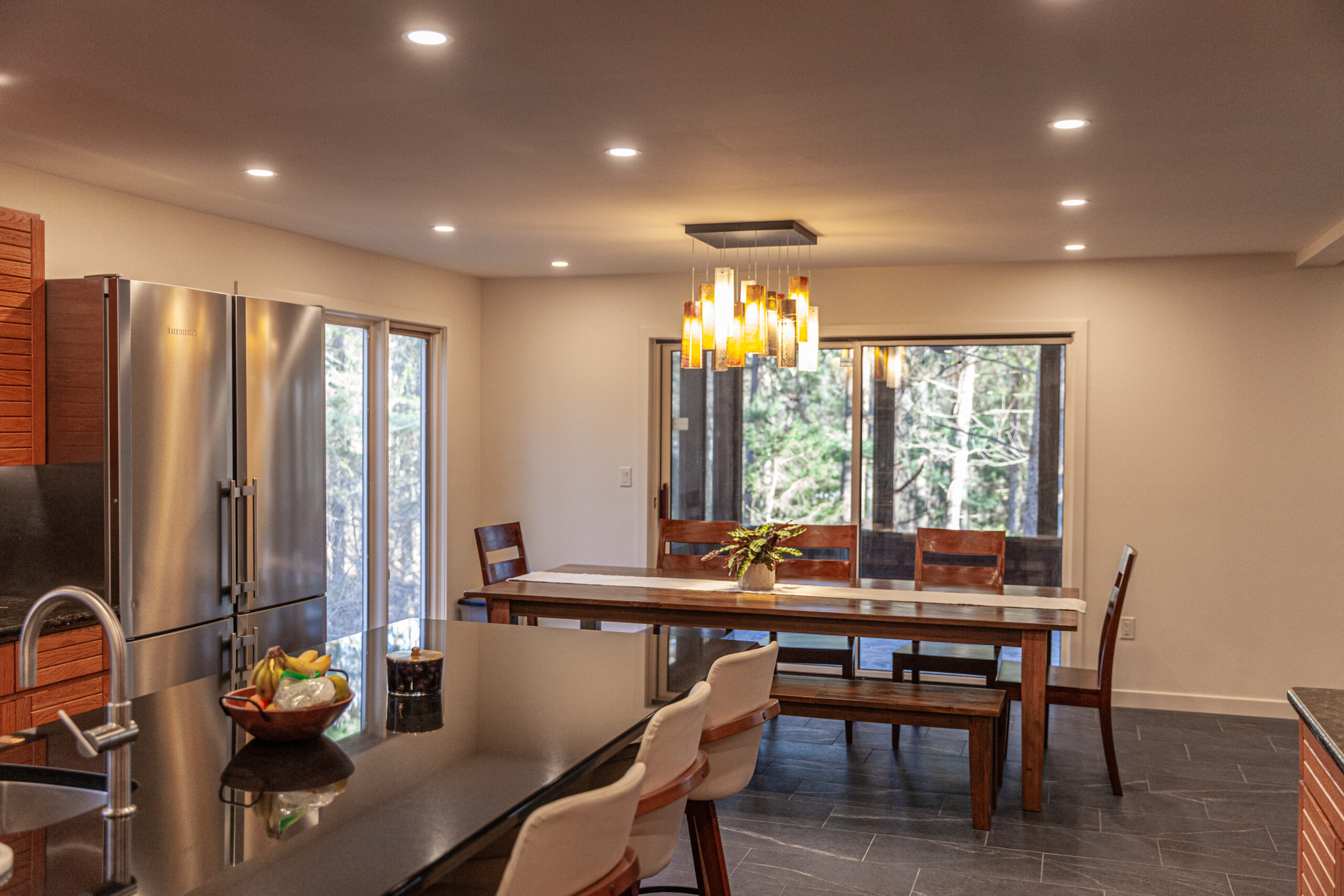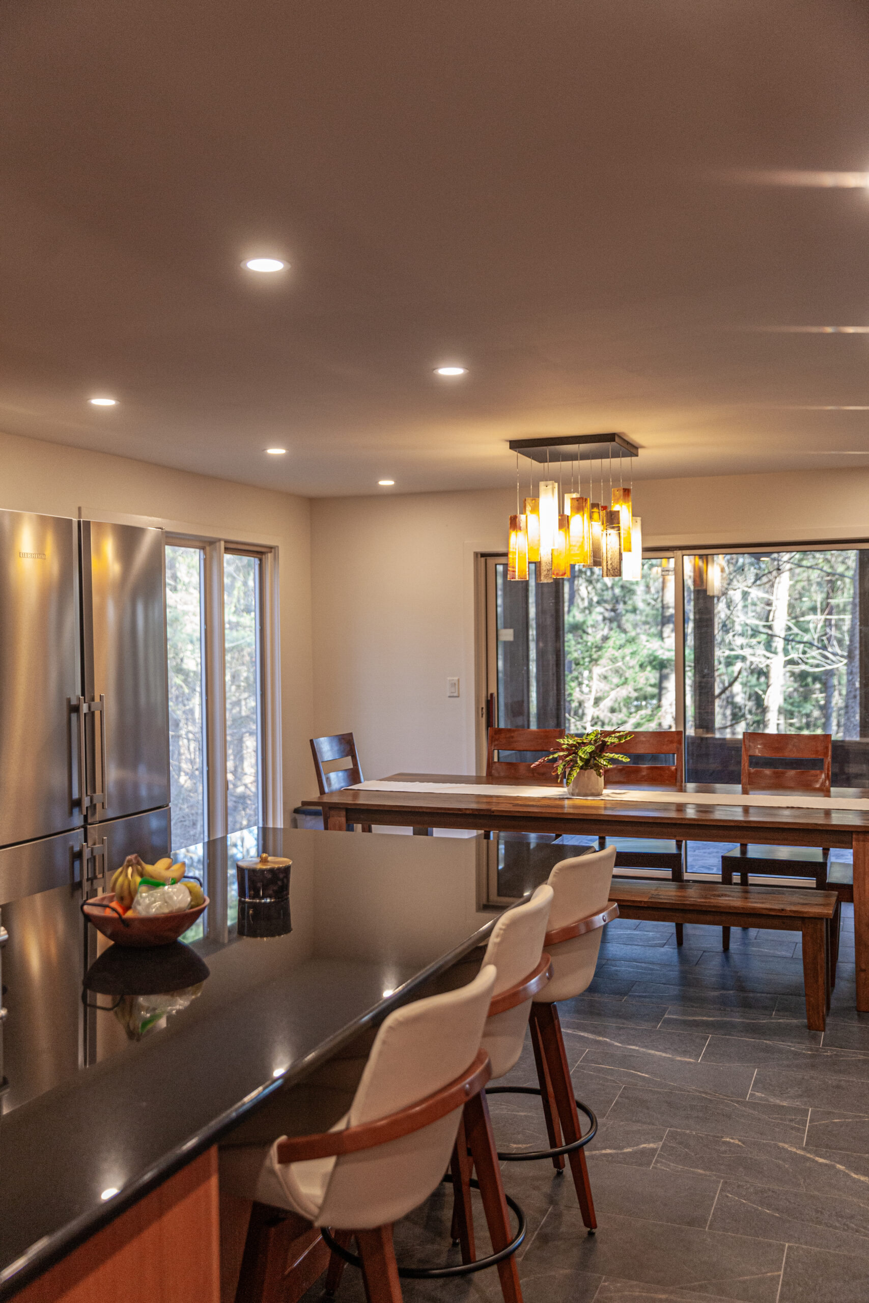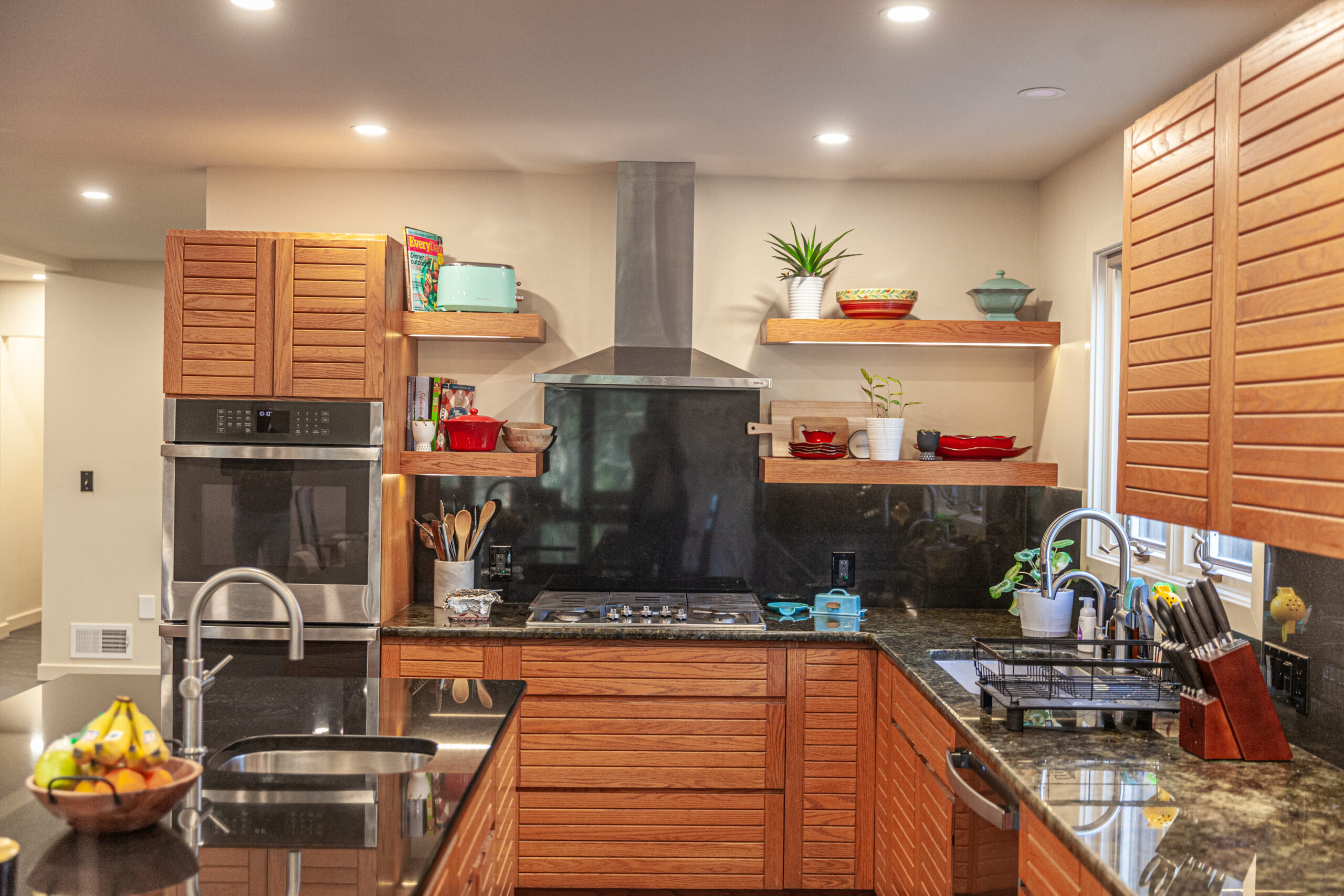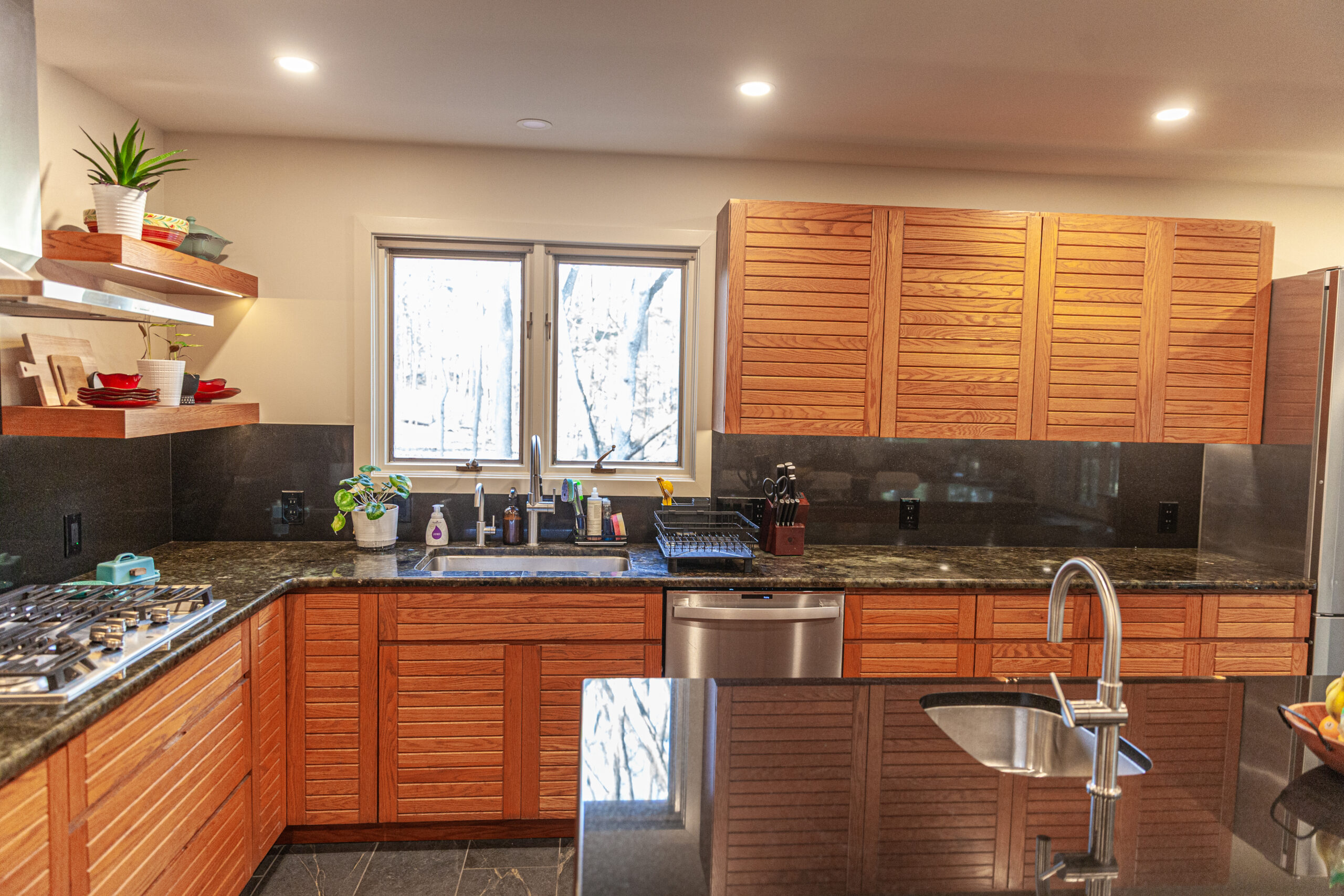 The homeowners already loved the Frank Lloyd Wright-inspired style and the gorgeous landscape around the home—they just wanted the inside to match that same feeling.